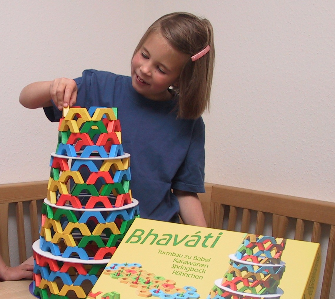 Die ungewöhnlichen Bauklötze des Bhaváti-Spiel lassen nicht nur den Turm zu Babel entstehen und wieder zusammenbrechen, sondern laden ein zu vielen weiteren Spielen. Für die jüngeren Mitspieler sind es ideale Bauklötze für unterschiedlichste Türme, Zäune, Muster und Mandalas, dann werden das Hühnchen- oder das Springbockspiel im Mittelpunkt stehen, später wird es sehr taktisch mit dem Karawanenspiel. Das Bhaváti-Spiel garantiert viele Jahre abwechslungsreichen Spielspaß in der Familie.