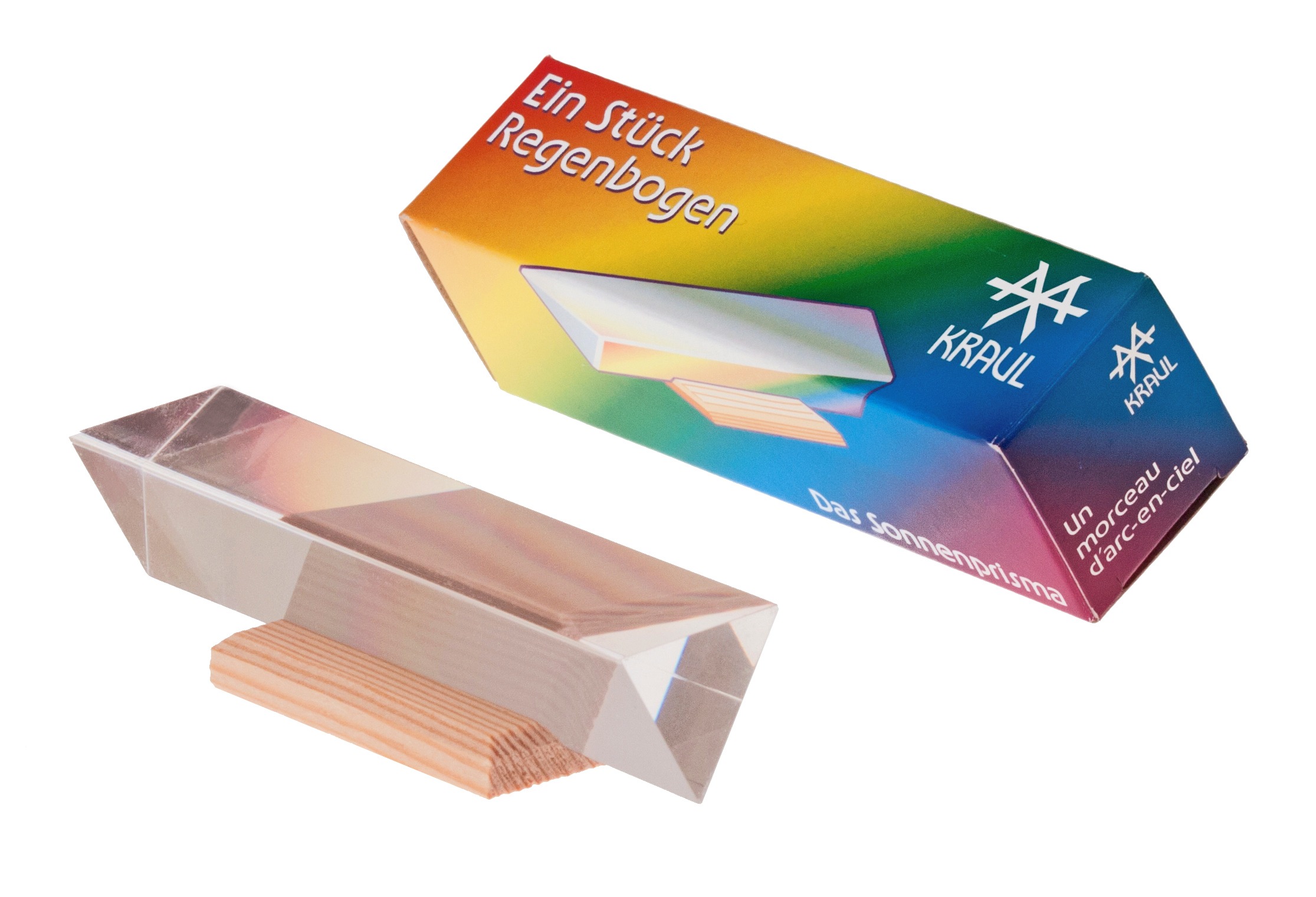 Hält man das große Prisma aus Acryl vor die Augen, so entstehen an jedem Übergang zwischen Hell und Dunkel farbige Ränder. Zur Freude in jedem Alter, auch im Arbeits- oder Krankenzimmer.