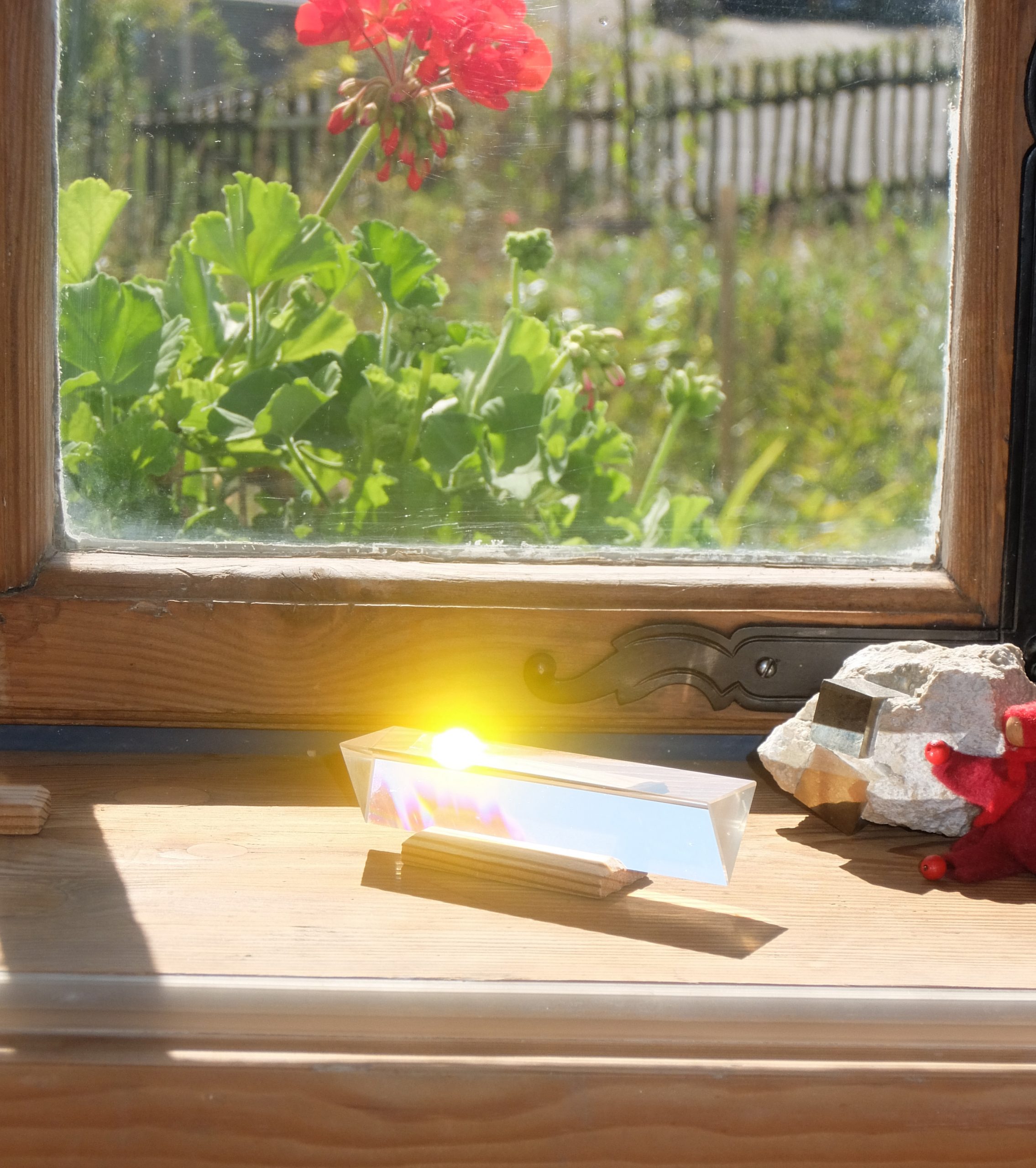 Ein Stück Regenbogen steht auf der besonnten Fensterbank. Scheint die Sonne auf das Prisma, so wird das Licht gebrochen. An der gegenüberliegenden Wand ist leuchtendes "ein Stück Regenbogen" zu sehen, das entgegen der Sonnenbewegung durch das Zimmer wandert.