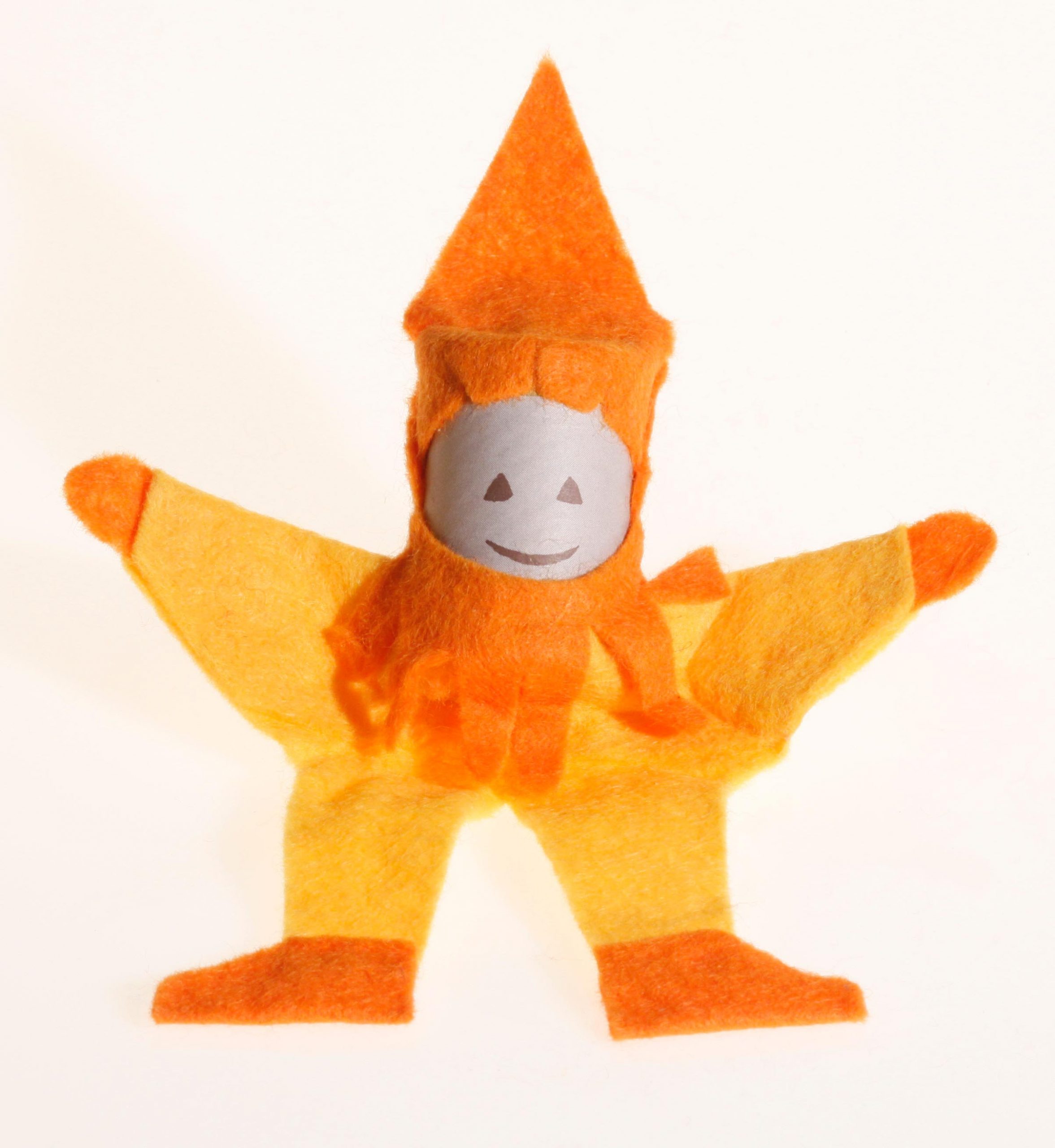15 cm gelborangener Purzel aus Filz, Pappe und Stahlkugel gefertigt