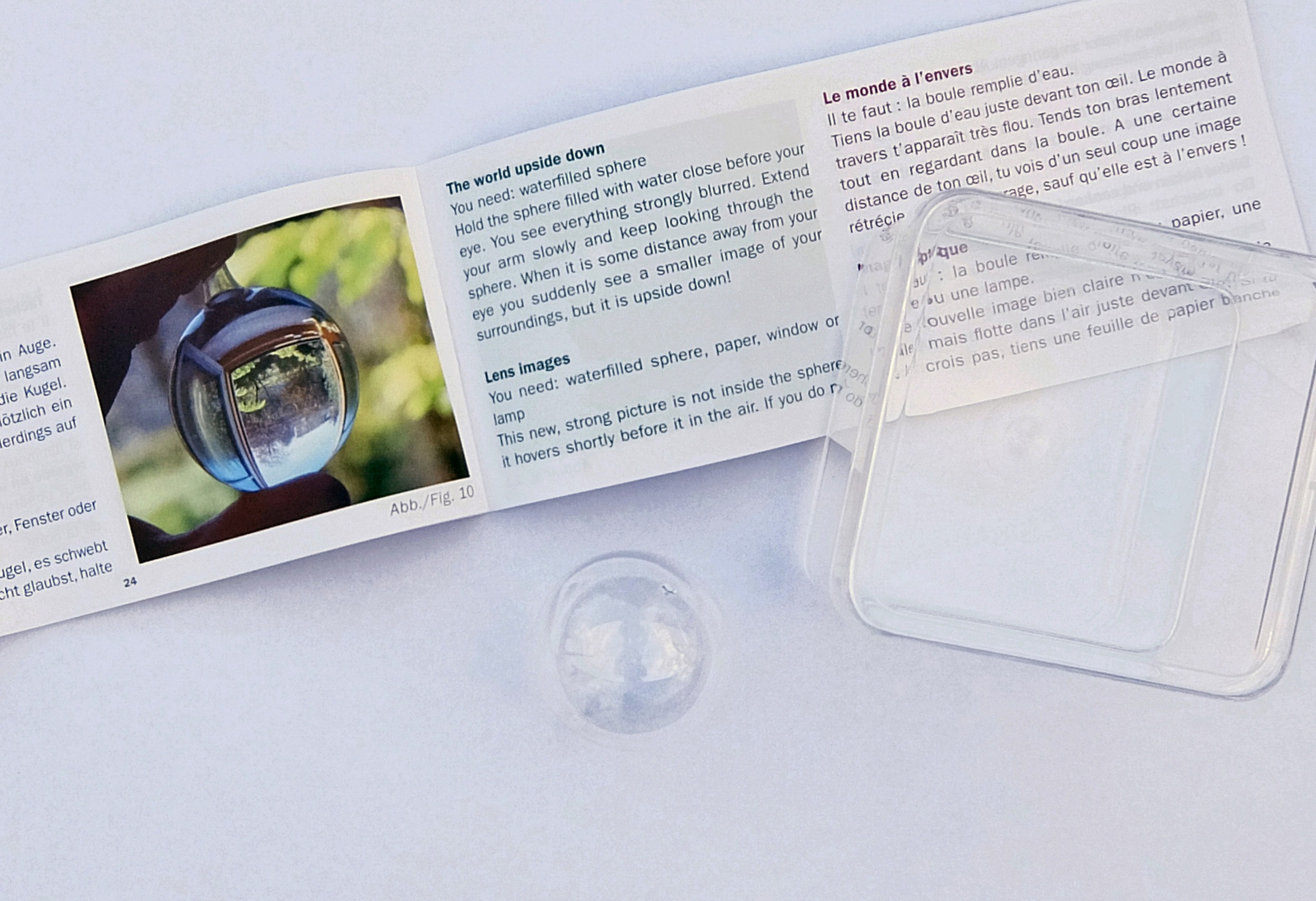 Teilweise oder ganz mit Wasser gefüllt wird die Gläserne Kugel zu einer Vergrößerungslinse. Unter Wasser gehalten entstehen Verkleinerungen. In der Welt der Optik begreifst du schnell, wie eine Lupe auch Brennpunkt ist oder die Welt "auf den Kopf" stellt.