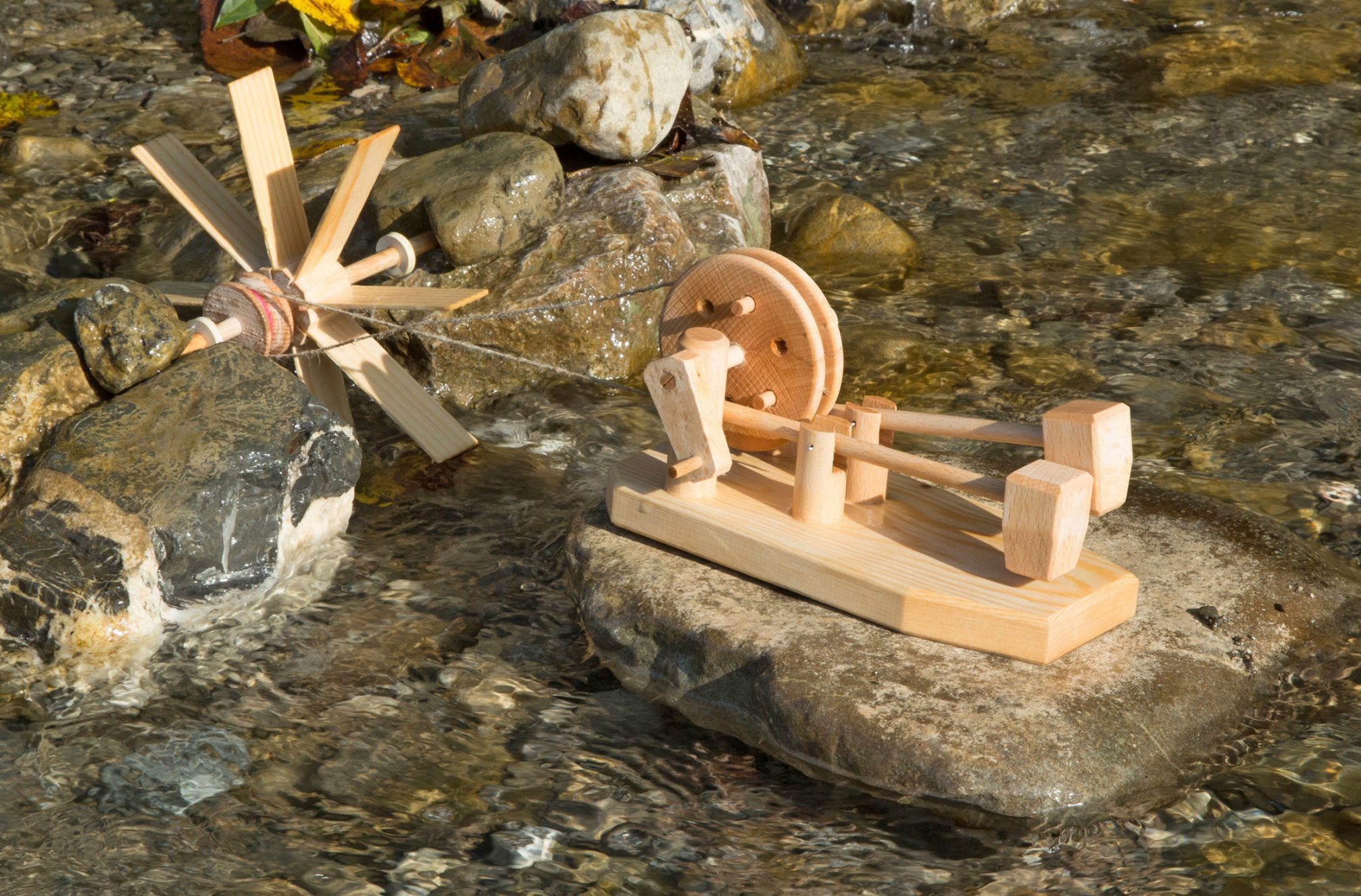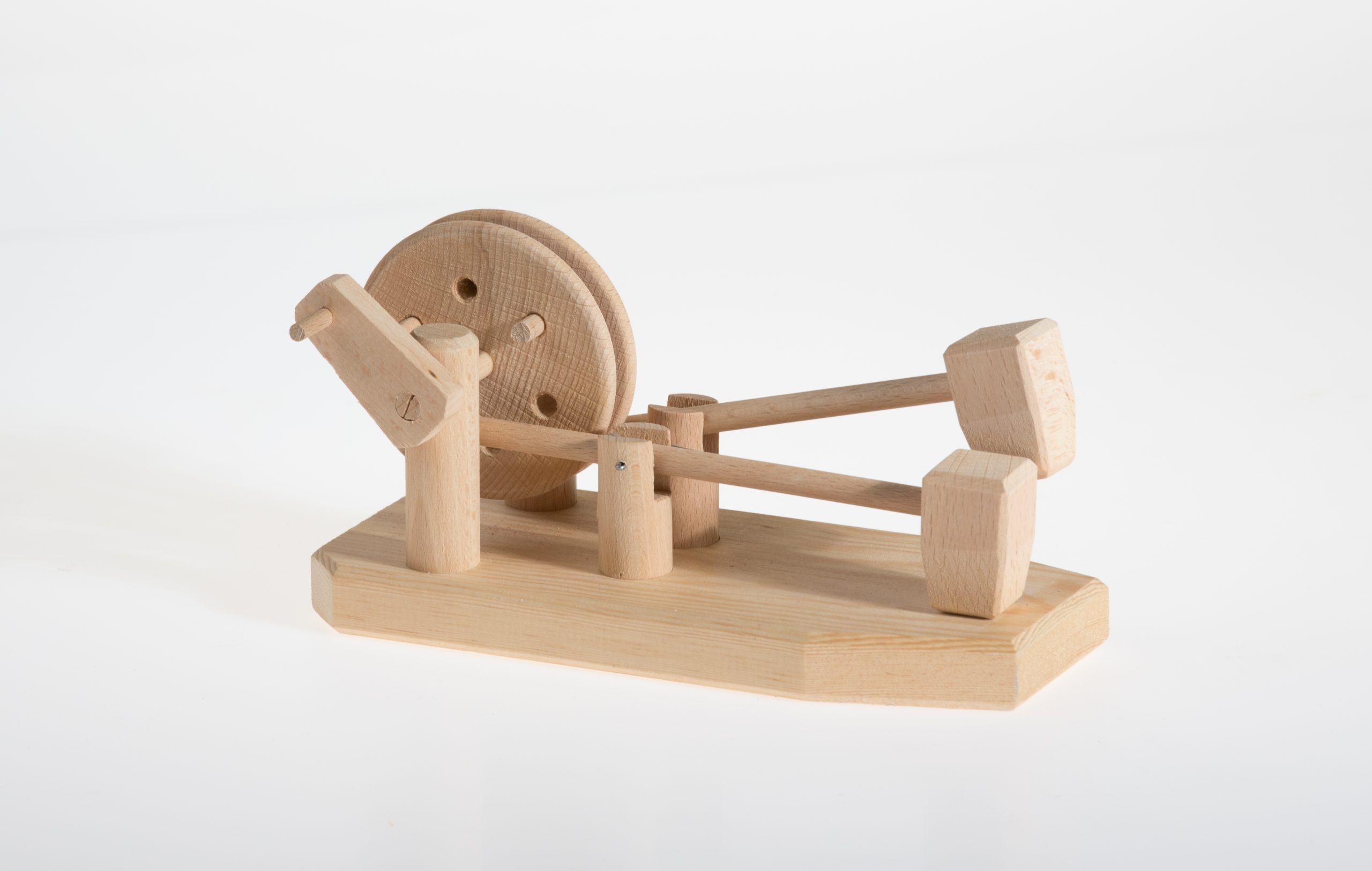 Das Hammerwerk klopft und hämmert in verschiedenen Rhythmen. Es lässt sich wie die großen Vorbilder in den alten Schmieden vom Kleinen Wasserrad, dem Turbinchen, dem Flussrad oder der Segelwindmühle antreiben. Mit der Kurbel lässt es sich auch mit Hand drehen.