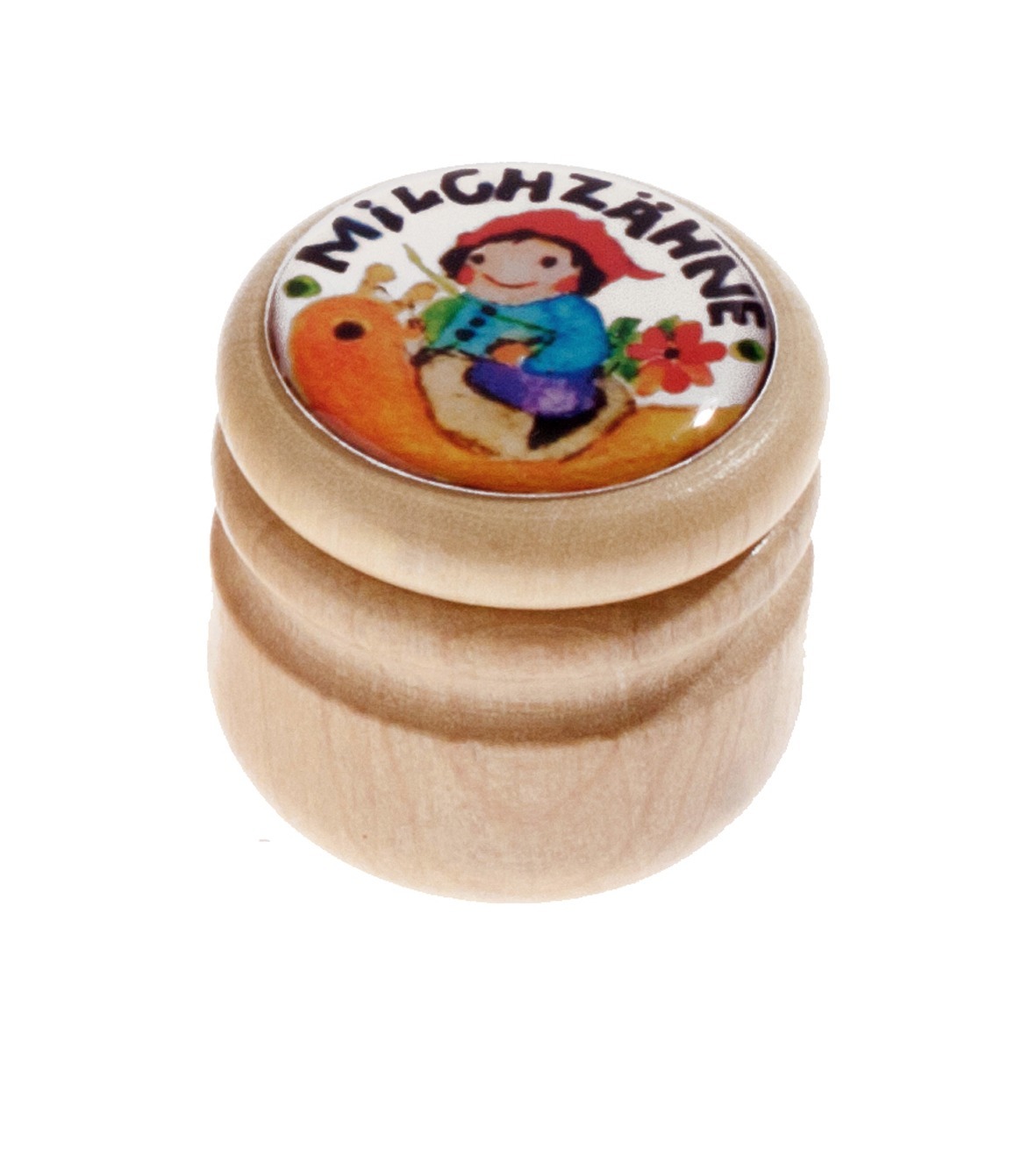 Die verschraubbare Milchzahndose (klein) aus Holz bewahrt die Milchzähne sicher auf.