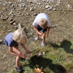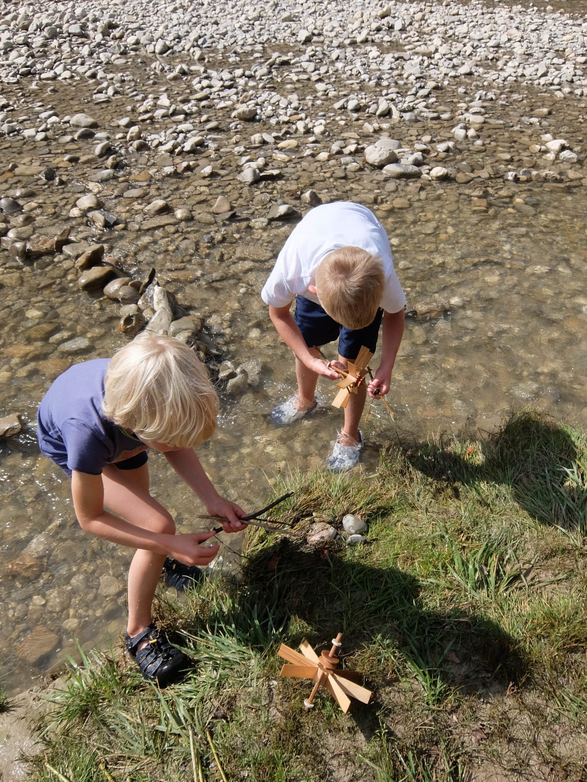 Das kleine Wasserrad wird vor dem Ausflug in den Rucksack gesteckt und bei der Pause am Bach zusammengesteckt. Man braucht keinen Kleber, denn kaum wird das Wasserrad ins Wasser getaucht, quillt das Holz auf und die Teile halten fest zusammen. Nun plätschert es bald im Bach zwischen zwei Astgabeln oder auf geeigneten Steinen als Lager. Vor dem Aufbruch nachhause nimmt man das Wasserrad wieder auseinander und lässt die Holzteile trocknen für den nächsten Ausflug.