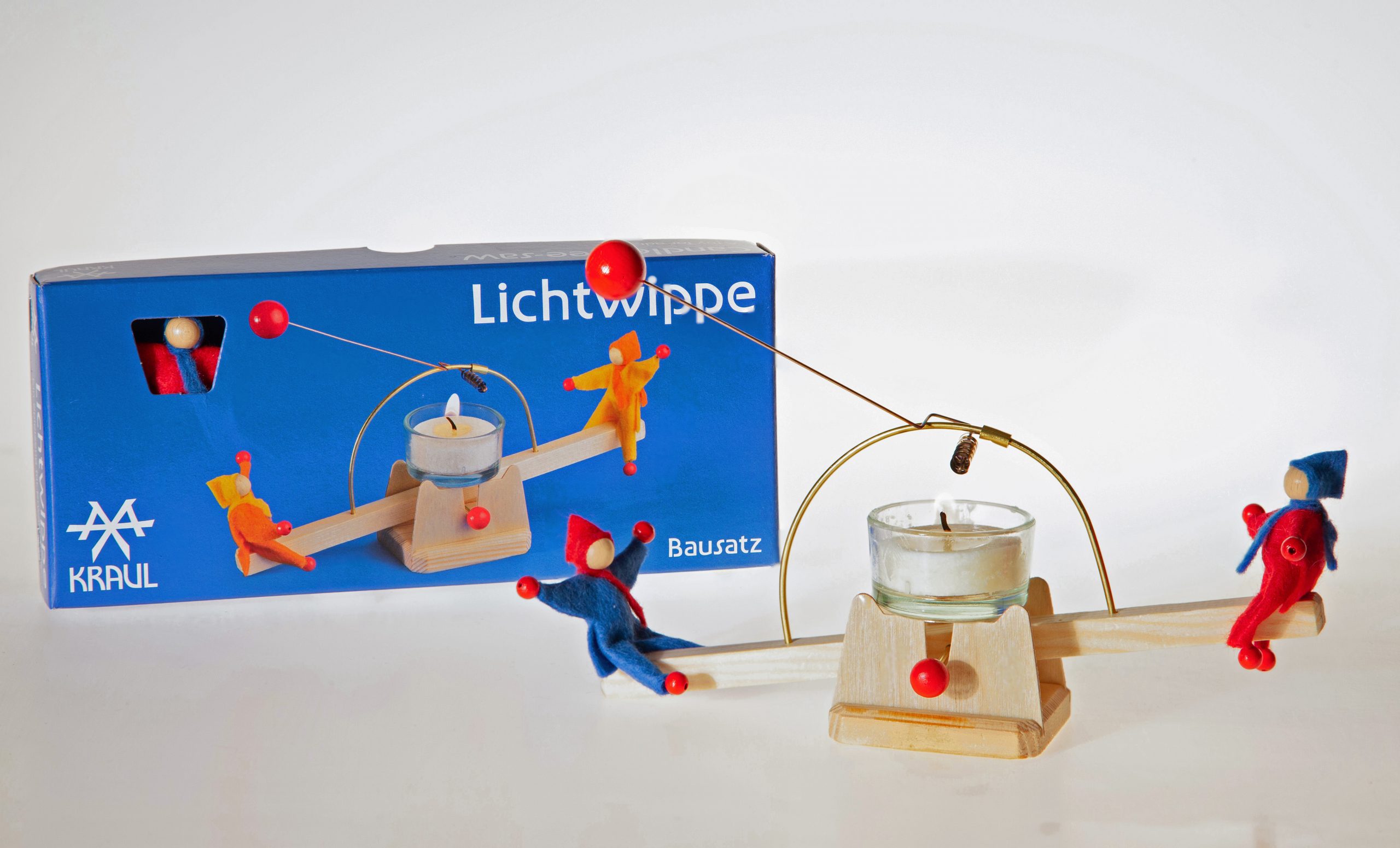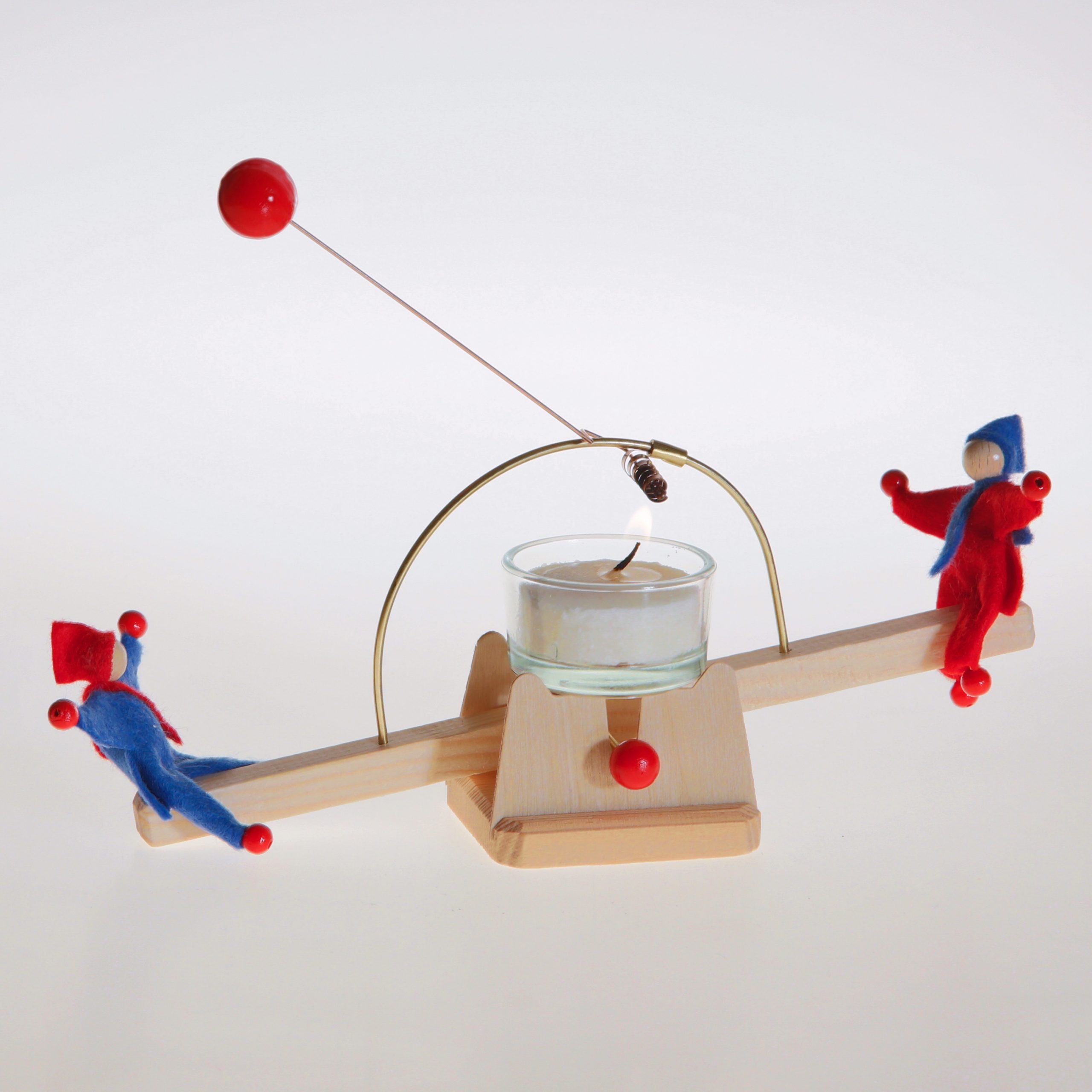Die Lichtwippe wird von einem Teelicht angetrieben. Der „Motor“ ist eine Feder aus Bimetall. Solange die Flamme brennt, wippen die gelb-orangenen Püppchen im gemütlichen Takt. Der Bausatz ist schnell zusammengesteckt, dann darf es im Kerzenlicht gemütlich werden.