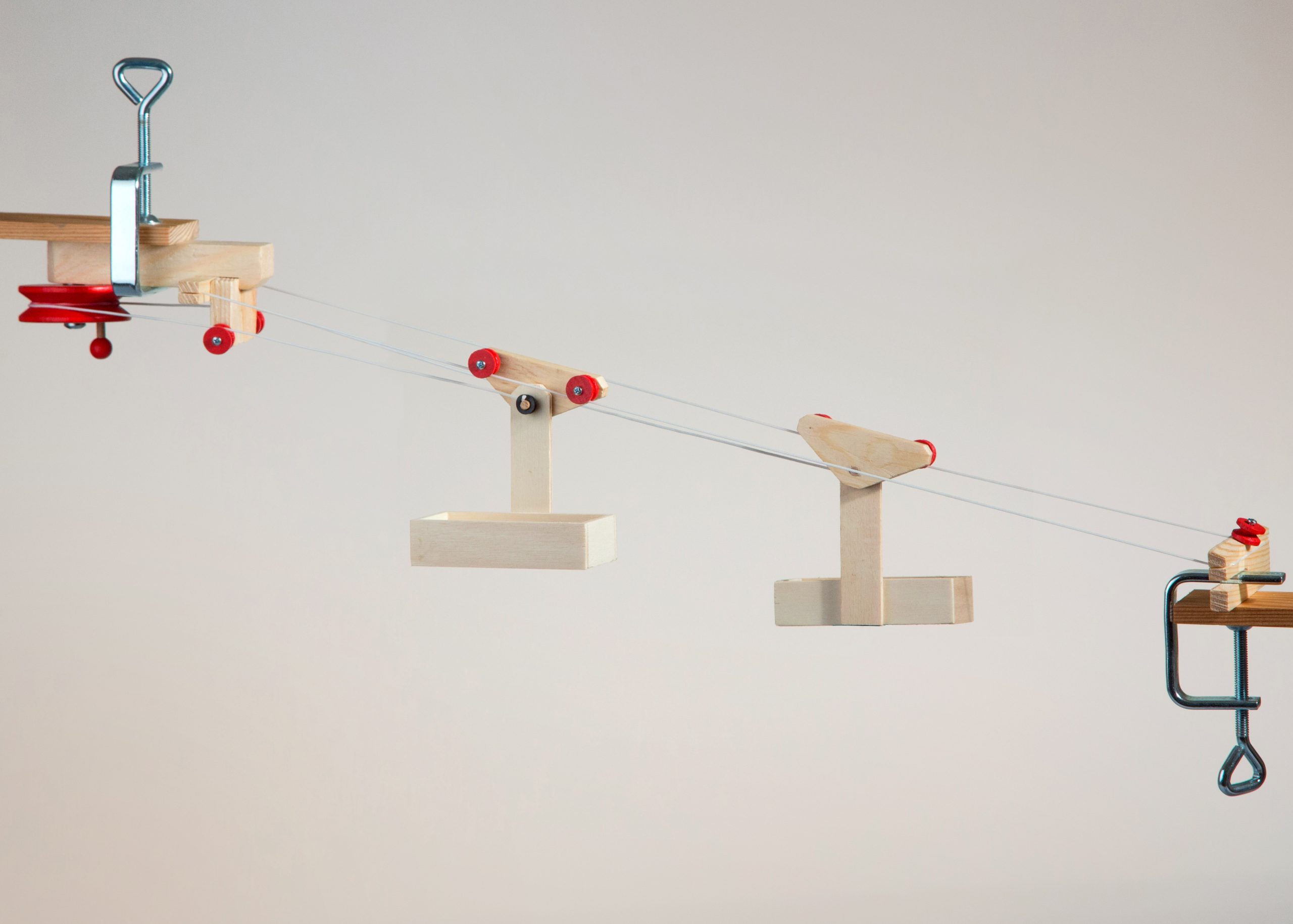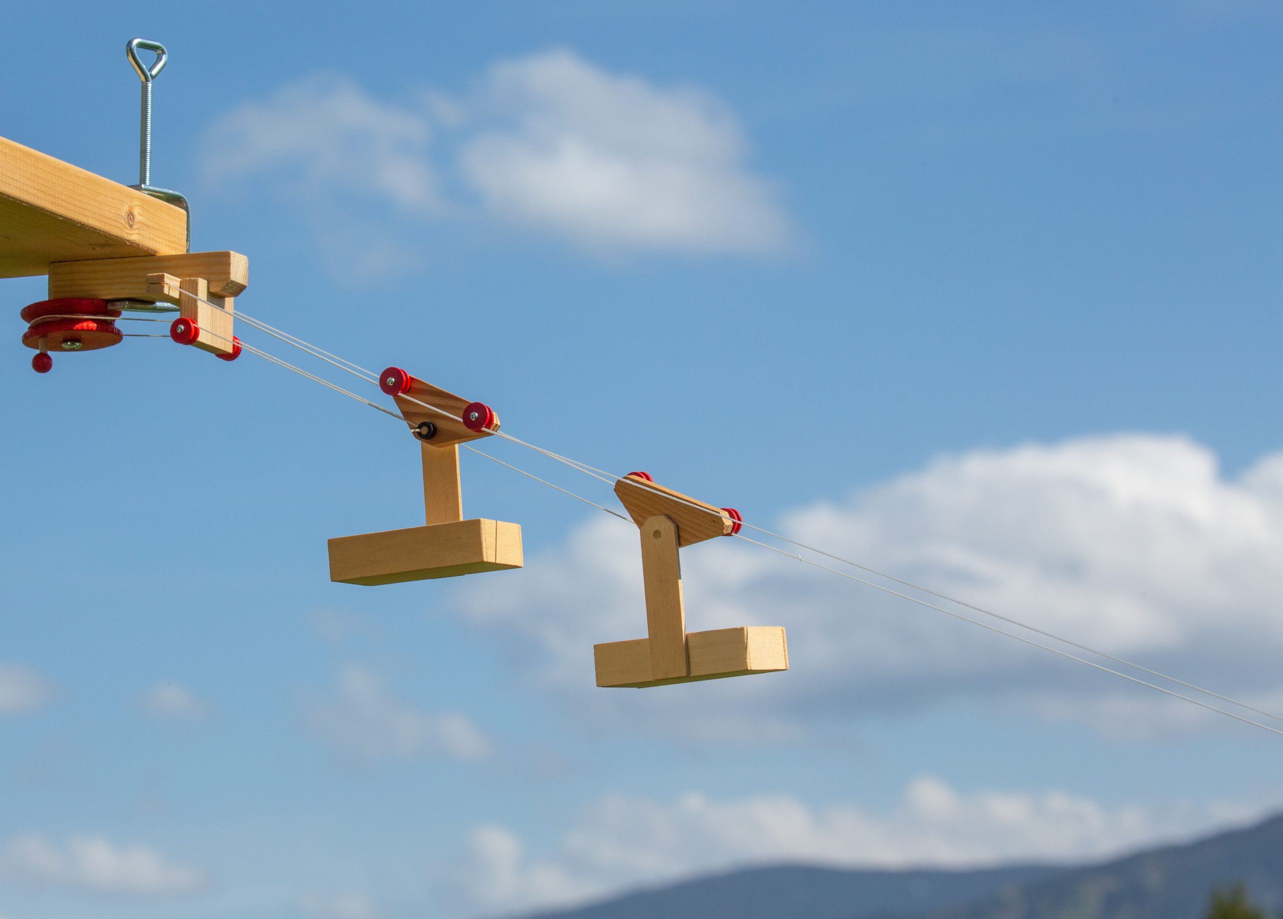 Das Zugseil verbindet die beiden Wagen miteinander. Wird an dem Rad gedreht, so kommt die eine Gondel herauf, während die andere abwärts fährt. Ein Bauklotz oder Stein als Gewicht in der oberen Gondel lässt diese abwärts fahren und zieht gleichzeitig den unteren, leeren Wagen nach oben.