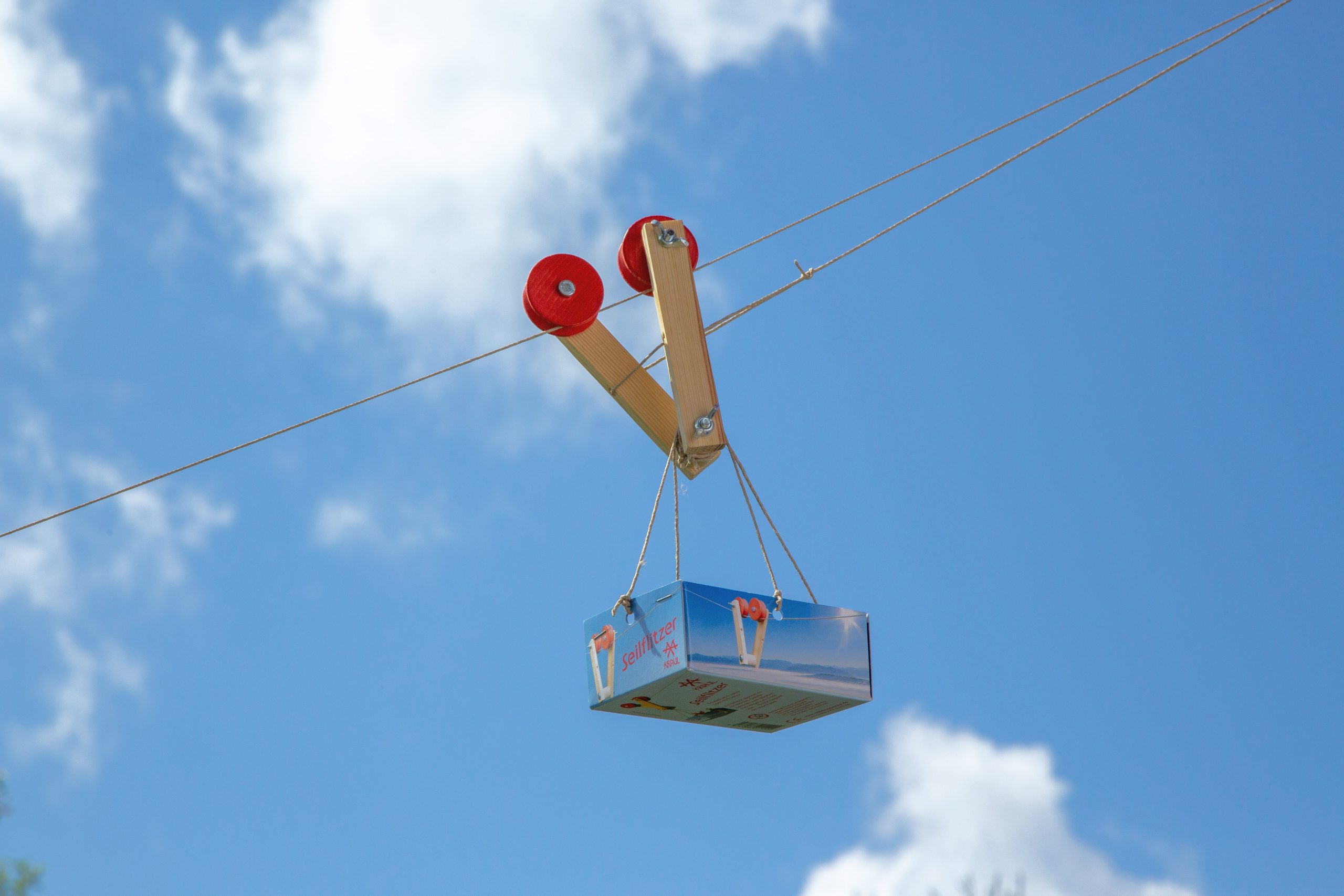 Die kleine Seilbahn bekommt den Schachtelboden als Gondel angehängt, das mitgelieferte Seil wird zwischen Baum und Stein oder Balkon und Gartentisch eingehängt und schon darf der Seilflitzer lossausen. Püppchen, Kekse, Steine, Spieltiere dürfen jetzt rauf und runtergondeln. Überall findet sich Platz für den Seilflitzer: Im Garten, am Balkon, im Zimmer oder auf Ausflug und Reisen.