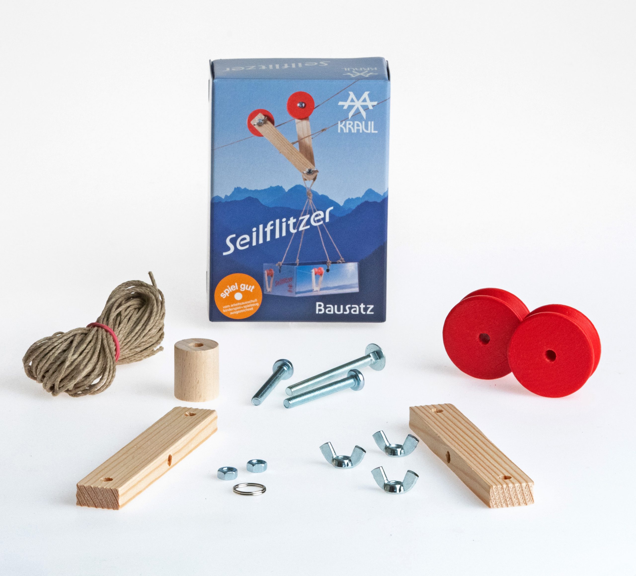 Der Seilflitzer ist ein einfacher Bausatz für Kinder ab 8 Jahren. Er findet in jedem Rucksack Platz und ist überall schnell aufgebaut. Dann haben auch Kinder ab 5 Jahren Spaß beim Spielen.