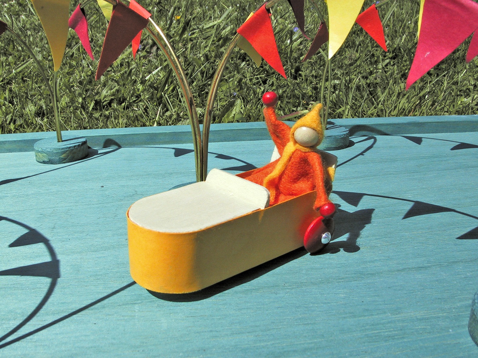 Eine schwere Stahlkugel unter der Kühlerhaube treibt den Wendolin an. Sobald seine Fahrbahn (z. B. ein Holztablett) etwas geneigt wird, fährt er immer vorwärts bergab, selbst wenn er dazu erst wenden muss. ein großer Balance-Spaß! Auch für kranke Kinder im Bett geeignet!