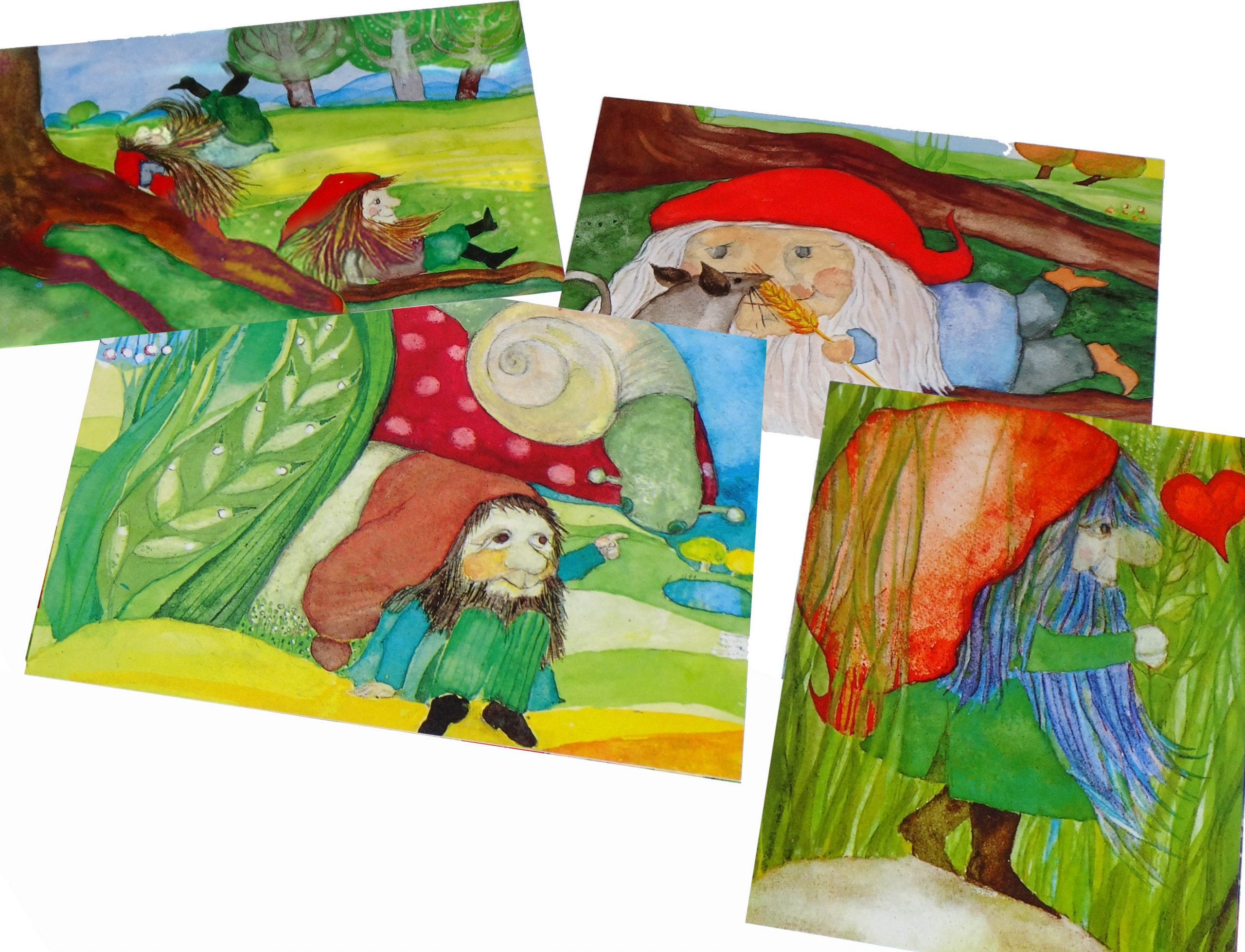 Die Zwerge-Postkarten von Eva-Maria Ott-Heidmann sind liebevolle Szenen von Zwergen mit Maus, Schnecke, Herz oder als Purzelzwerg. Schöne vielfältige Motive, die man gerne an liebe Menschen verschickt.